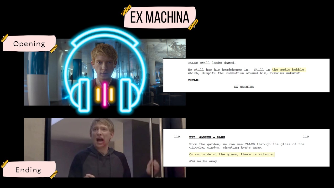 I would have easily missed it if I had only watched the movie. But reading the Ex Machina script made it impossible to ignore: Caleb’s isolation from the world is framed through sound, in both the beginning and the end.