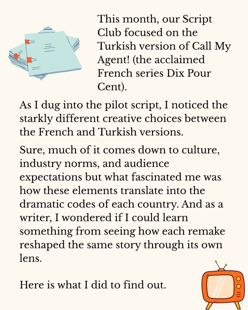 This month, our Script Club focused on the Turkish version of Call My Agent! (the acclaimed French series Dix Pour Cent).