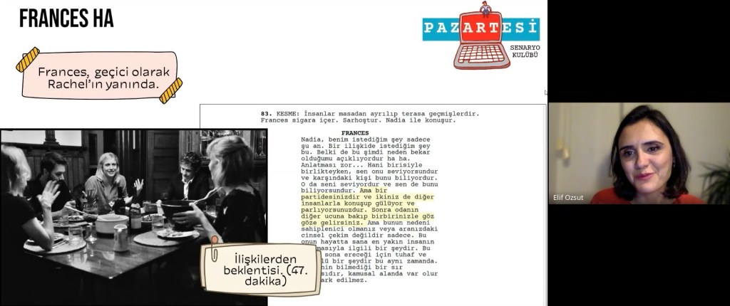 9. Broadening the scope: In the following months, we dived into the scripts ofFrances Ha, The Truman Show and The Sixth Sense, together with dear screenwriters Elif Özsüt, Fikret Bekler and Duygu Yıldırım İleri. Just as I was starting to worry that we might only be talking about American films and drifting away from Turkish stories, April brought a turning point. We met with Meriç Demiray after reading his own script Martıların Efendisi. After that came Turkish series: Afilli Aşkwith Barış Erdoğan, Aşk Oyunu with İlker Arslan, İkinci Bahar with Ayhan Sonyürek and Menajerimi Ara with Yeşim Çıtak. It is almost impossible to access original Turkish scripts if you’re not in the industry, so I’m deeply grateful to them for sharing their scripts with me and our participants.